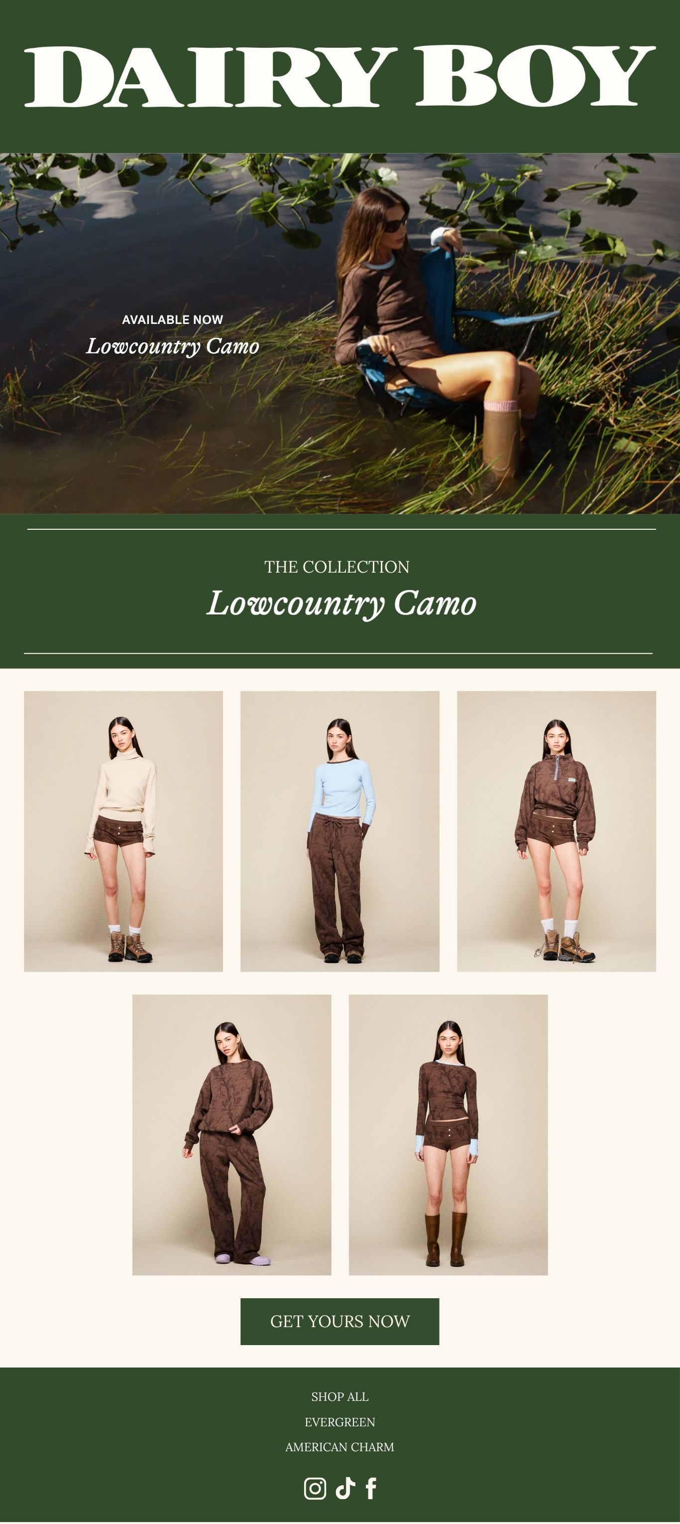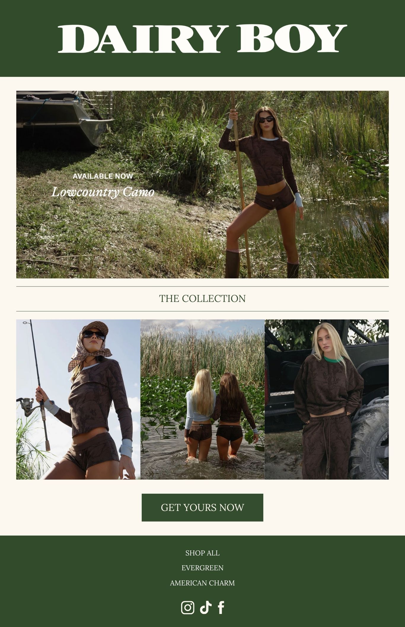 3 Mock Email Campaigns for Dairy Boy's new Lowcountry Camo launch.