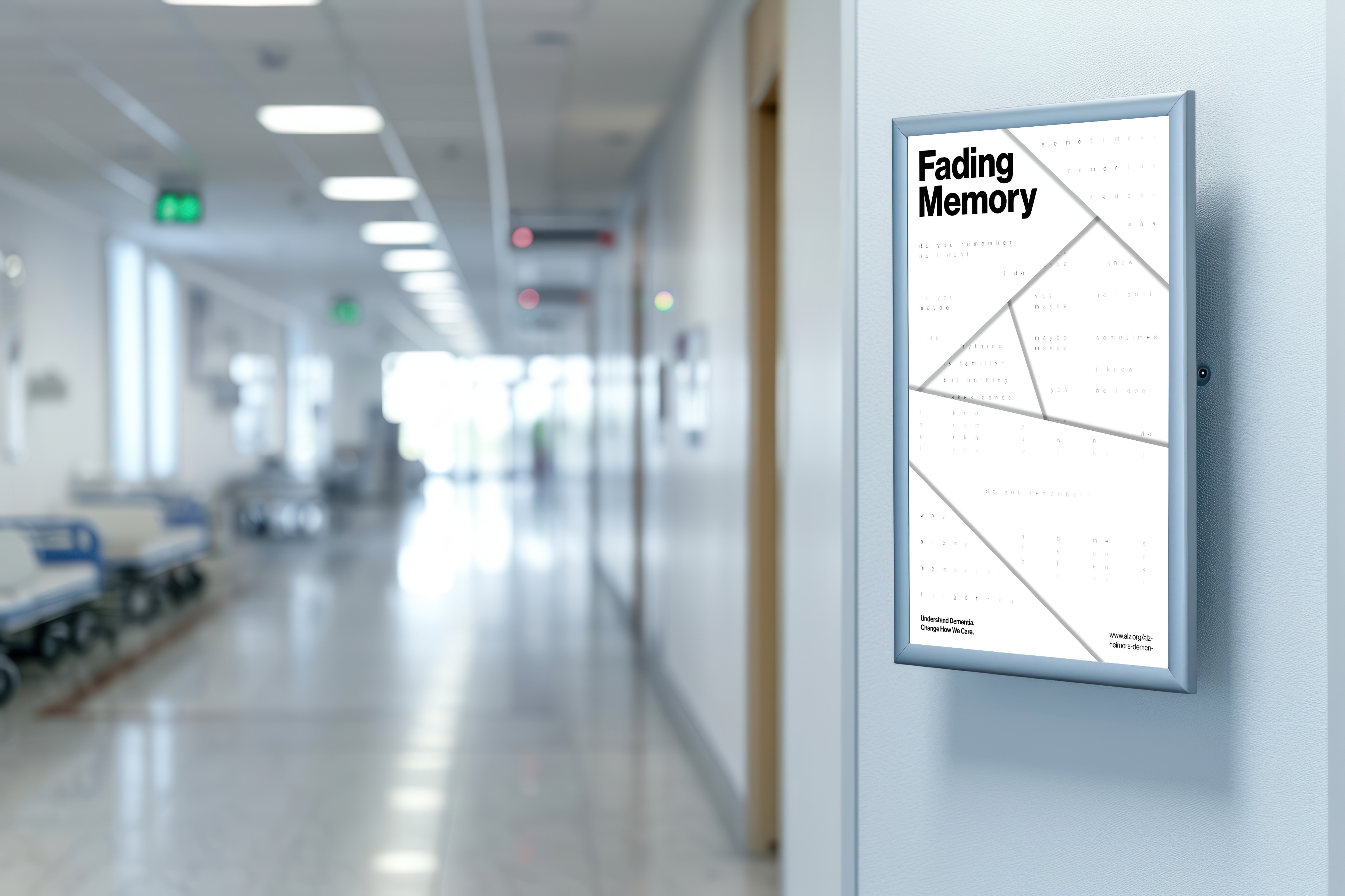Fading Memory is a social campaign for dementia awareness designed for display in hospitals and clinics, highlighting the overlap between past and present memories and the confusion often experienced by dementia patients. The campaign includes a motion graphic that visually expresses this disorientation through layered movements, fading text, and shifting letters.